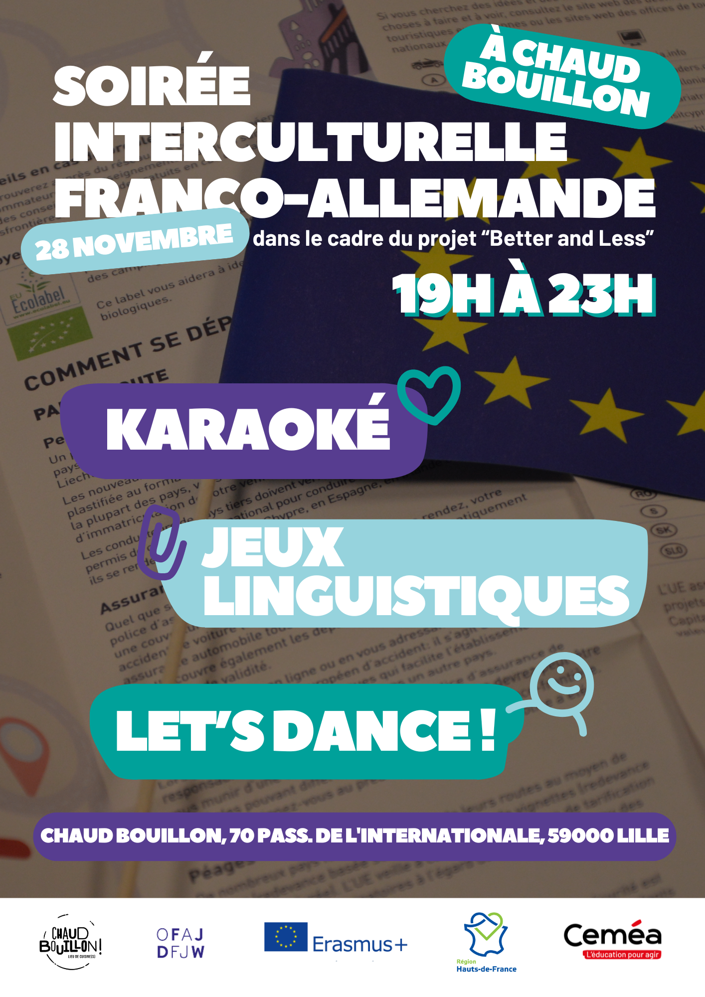 Le secteur école des Ceméa vous invite à une soirée interculturelle franco-allemande le vendredi 28 novembre de 19h à 23h à l'espace Chaud Bouillon à Lille. Cette soirée organisée dans le cadre du projet « Better and Less » sera l'occasion de passer moment convivial pour découvrir, échanger et célébrer les cultures qui nous rapprochent. 📅 Vendredi 28 novembre 🕠 19h à 23h 📍 Chaud Bouillon, 70 pass. de l'internationale, 59000 Lille 😮 Gratuit et ouvert à tous